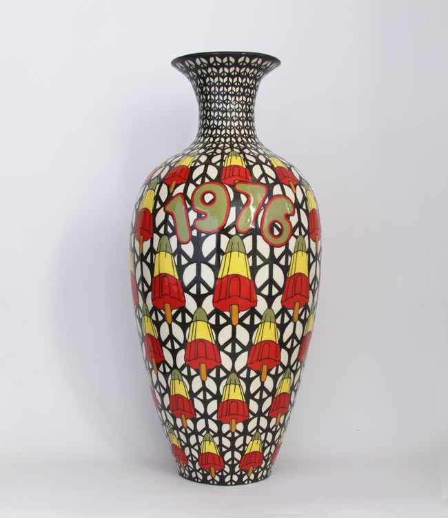 In preparation for the exhibition let’s revisit how I make the work. The process is probably over complicated by me and it is certainly a long winded making process. Someone said to me when they saw the Mivvi jars all in a row a few days ago, ‘Oh wow and you do this on the computer then stick it on?’ And I suppose it does have that quality of looking somewhat seamless, but really that has just come with years of practice and getting better at it.Every step and process is done by my hand and it begins at the potting stage when I am making the shape. All the jars and vases are hand built with coils, slowly and carefully. The ZOOM 1976 vase below is 55 centimeters high and took me 5 days to make. The painting took me a whole lot longer though! Why 1976? Well, it was a very good summer, but it will mean different things to different people.
