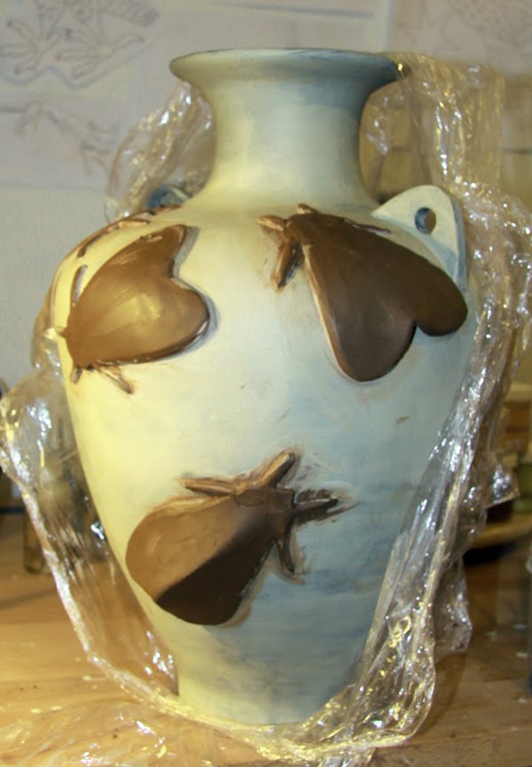 The moths are in various stages of take-off and I think that this is the frightening element and they are twice life size too. I am using clingfilm to handle the moths through and there is a lot of scoring and slip to fix, I hope they stay on. Maybe a bit more tomorrow if I get the chance to work on it. See earlier post for colour of the moths, the background however will be darker in every sense of the word.
