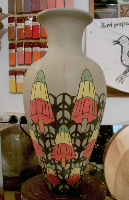 The Zoom Lolly Vase after 5 days of painting. Korea is in the news still and this has brought out the peace symbols. Could these Zoom lollies we more sinister or is it just the tide of what is going on globally that makes me feel this? The whole of the lower half of the vase is covered in slip now, there was a technical nightmare with the ever decreasing circumference of the vase to deal with. In the end each peace sign had to decrease very slightly in size to fit into place. Heaven knows how I am going to deal with the tapering neck and the flaring lip tomorrow.